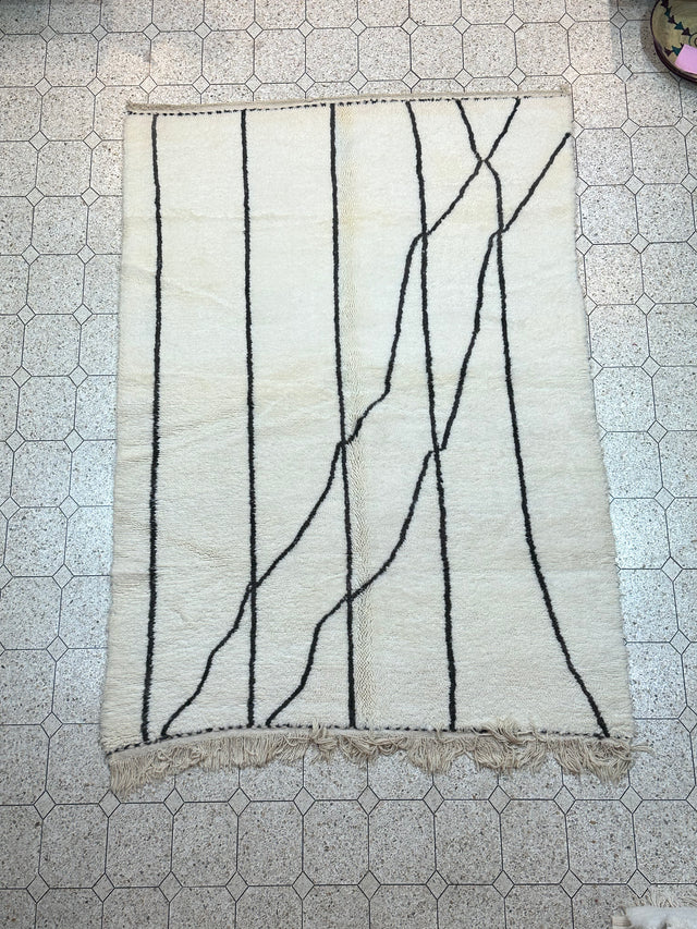 Beni Ouarain carpets are made by the Berber tribes of the North-Eastern Middle Atlas Mountains in Morocco. Traditionally used as bedding to keep warm duing the cold winter months, they are handmade, double-knott, un-dyed 100% natural wool carpets - characteristically heavy white/cream pile with geometric diamond designs – each one unique.